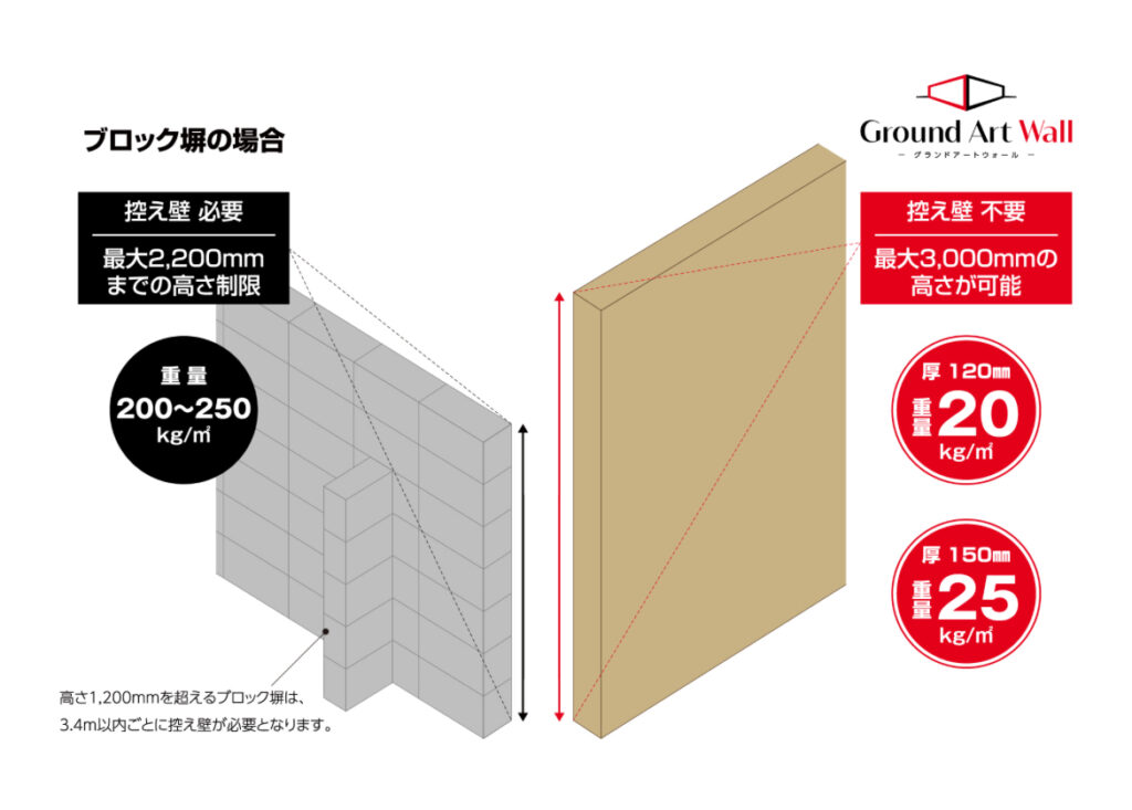 グランドアートウォールの「特殊発泡素材」は、コンクリートブロック塀の約1/10の重さです。